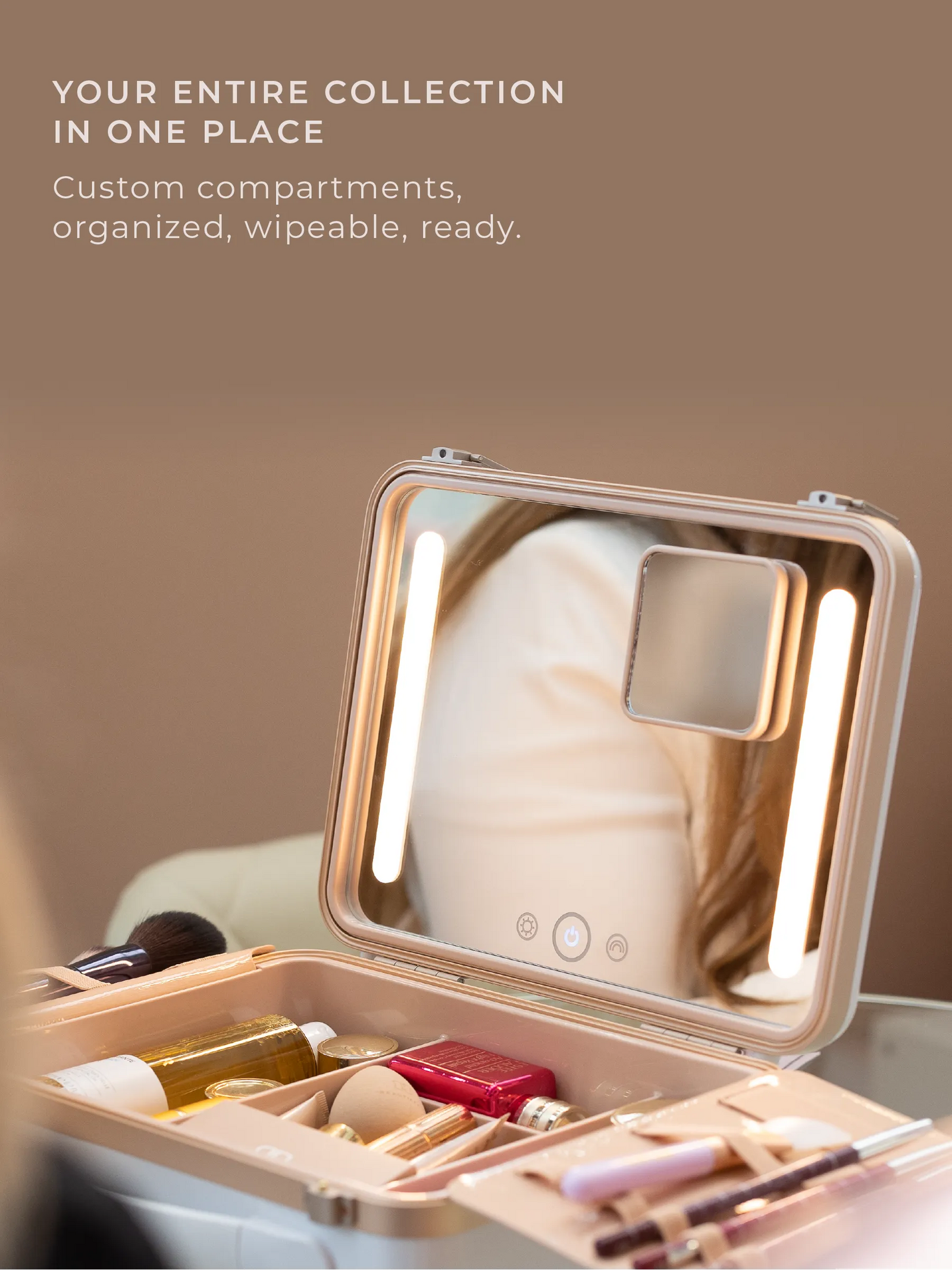 Beautifully organized designated compartments and flaps separate your pencils and brushes, keeping all your makeup illuminated and exactly where you last used it, making getting ready easier and faster than ever. Sturdy enough to protect your makeup while traveling, and designed to hold everything you would fit in a large makeup bag for daily use.