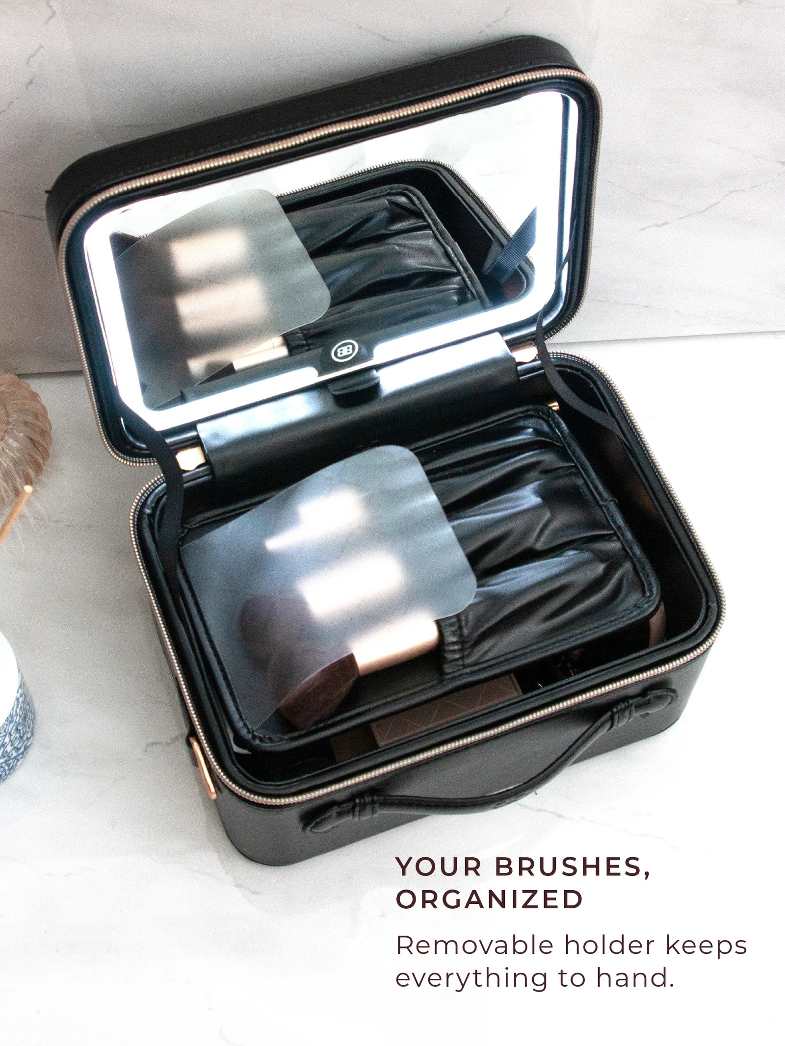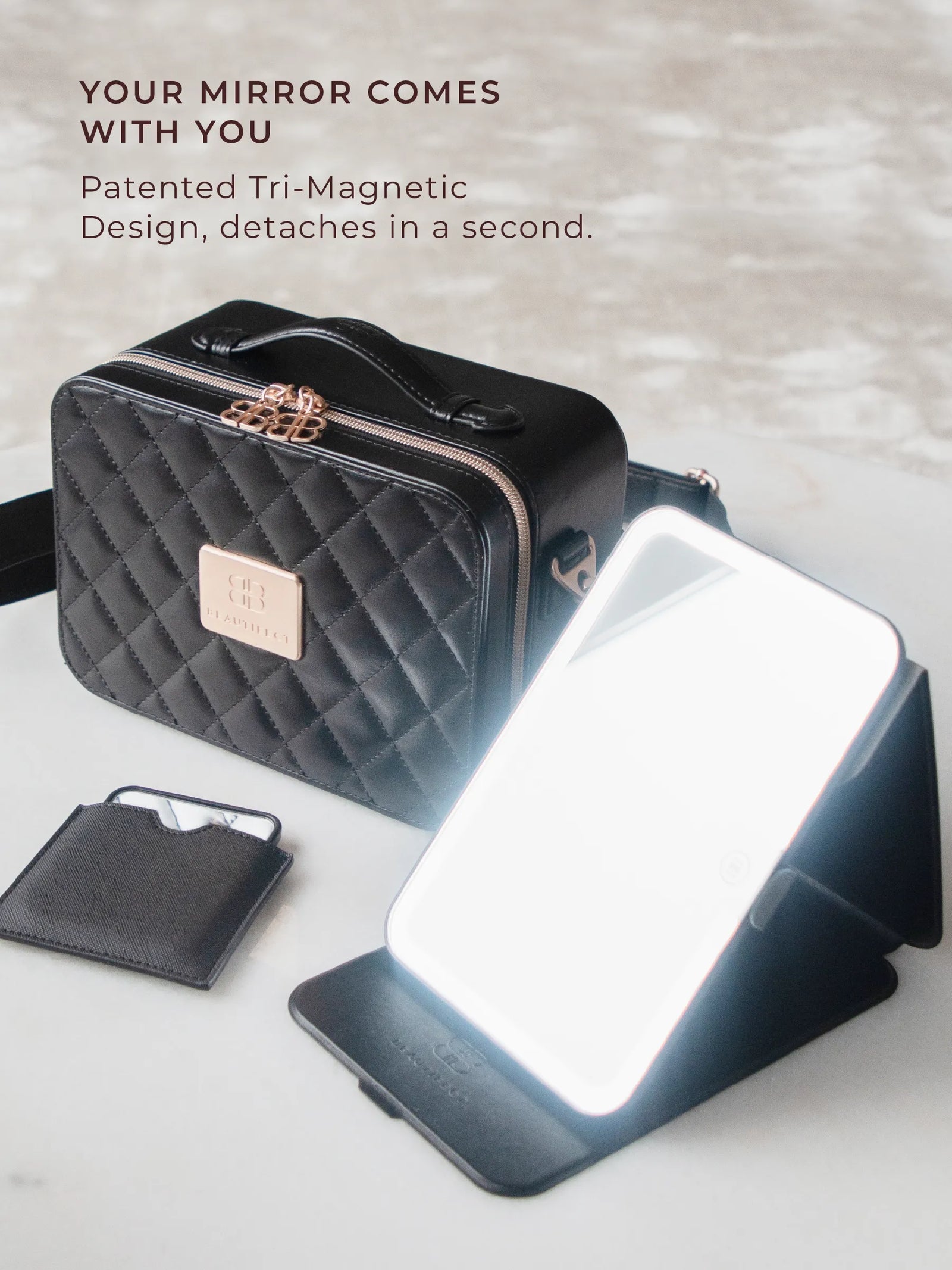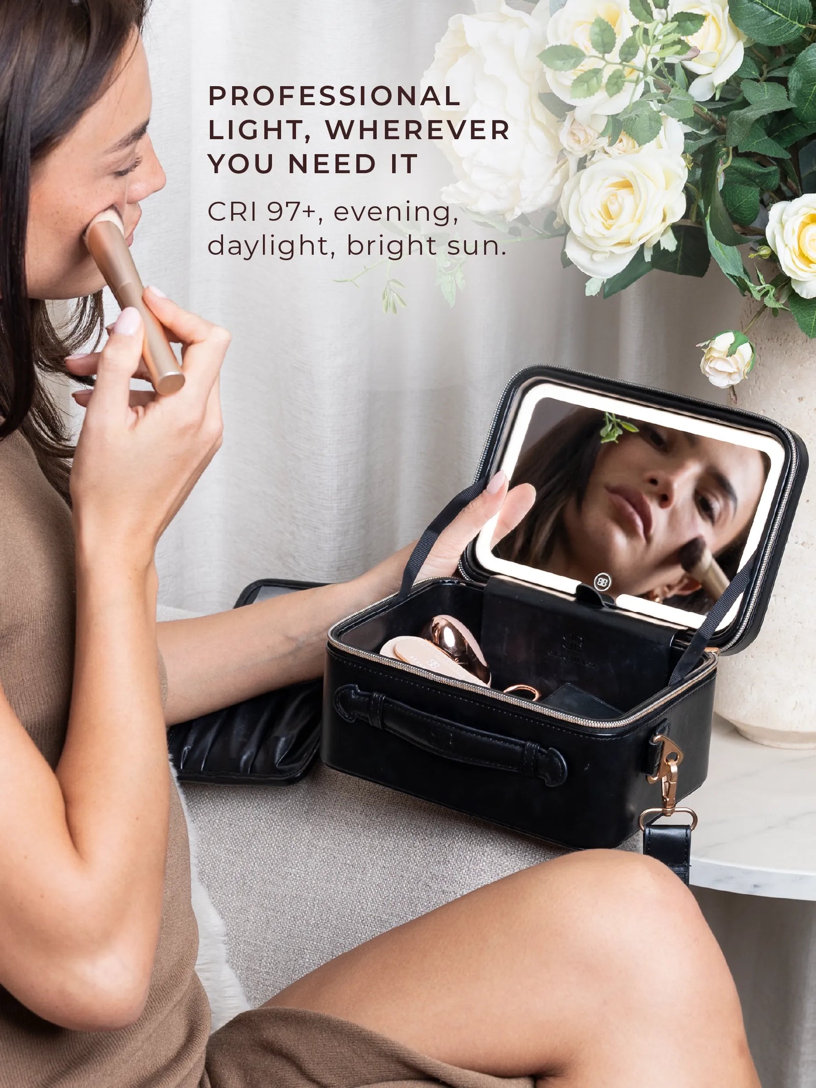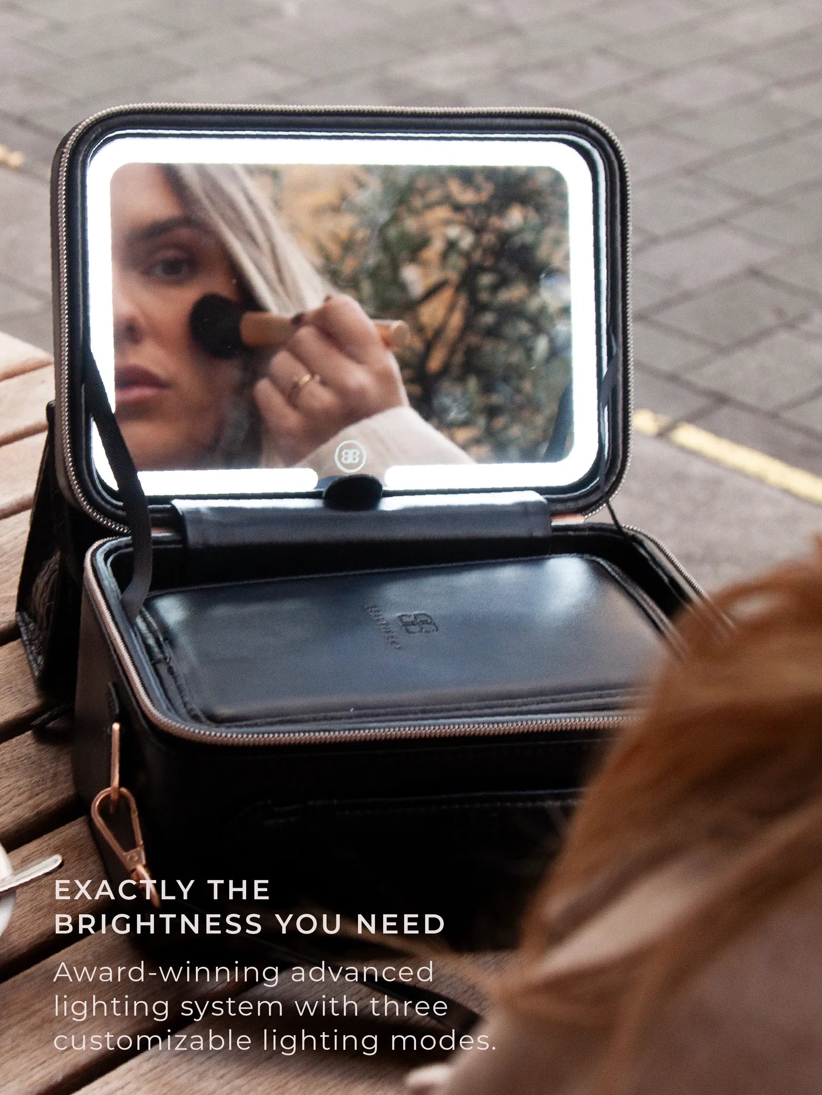Award-winning portable beauty studio with true-to-life lighting, a CRI of 97+, and a patented removable LED mirror. Vegan leather case with three carry options and a brush holder, built to go everywhere you do.