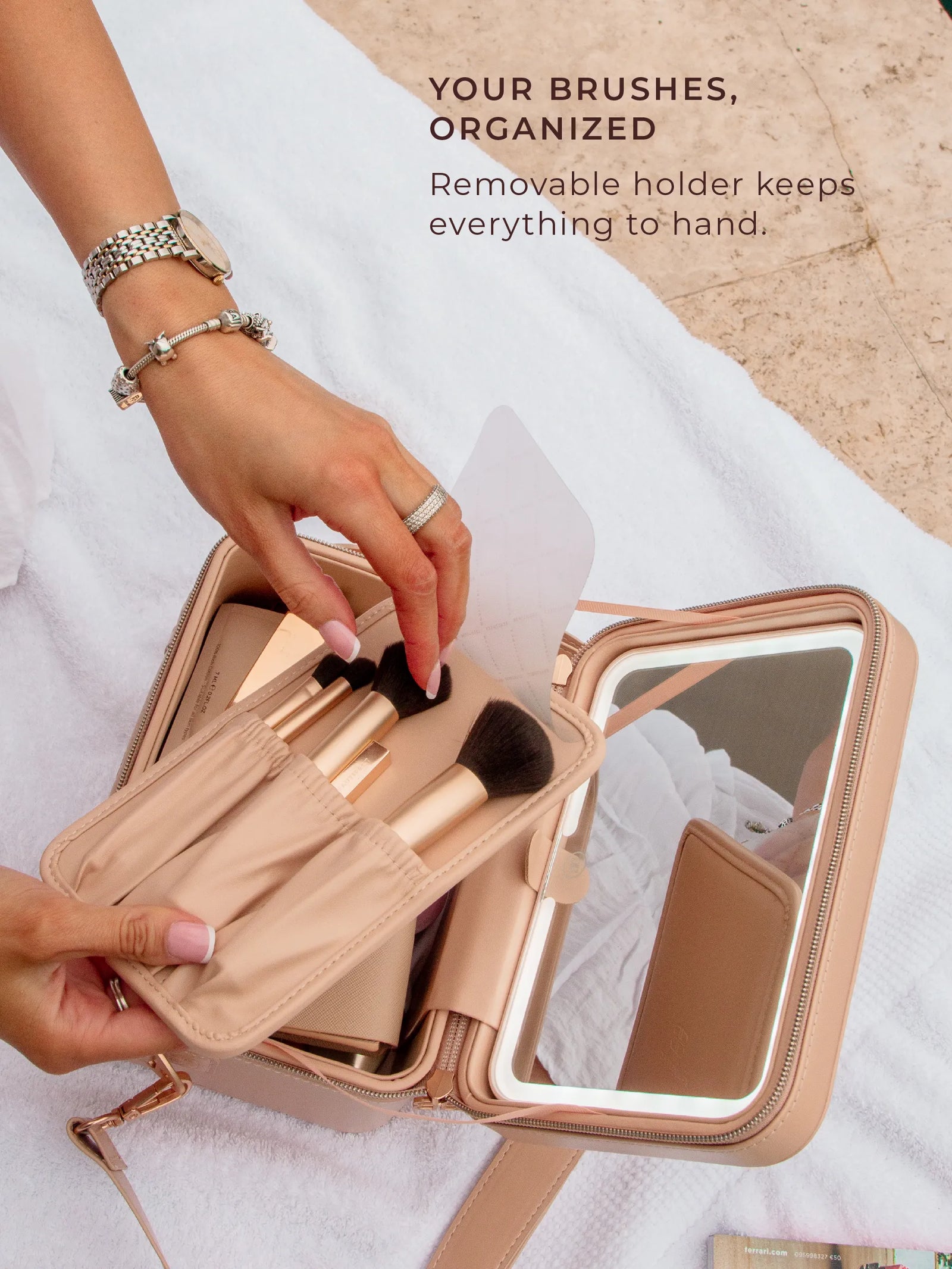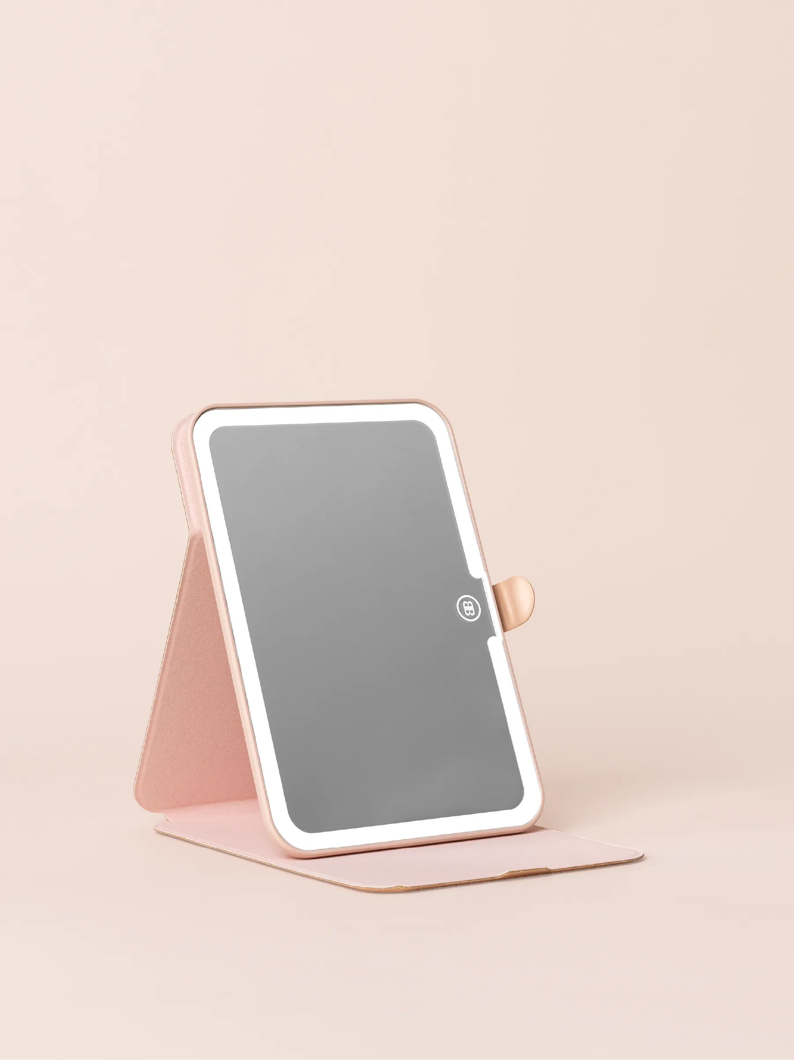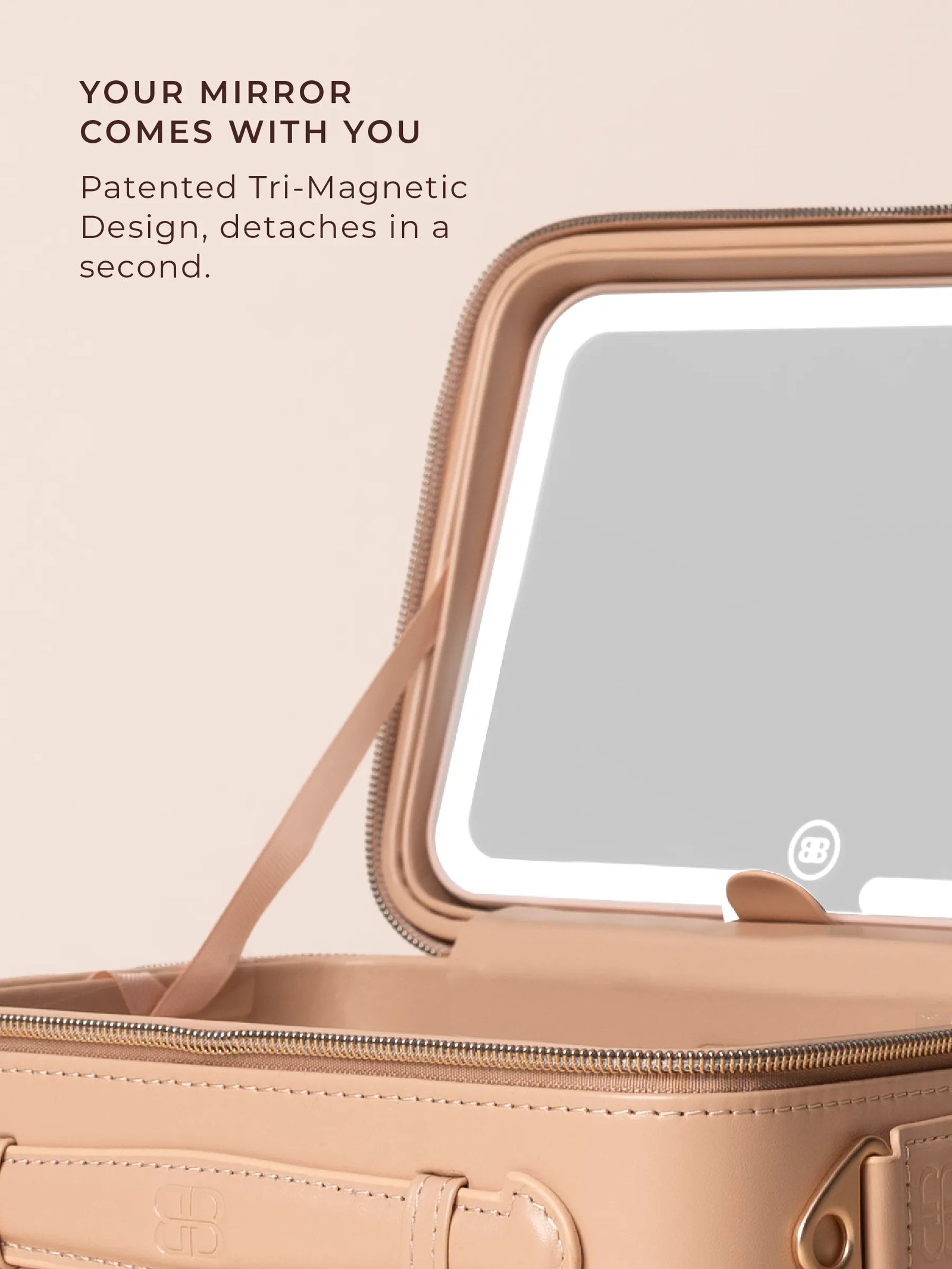 The GO mini, 5x Magnification Mirror and its protective vegan leather sleeve, bundled together in a coordinated Nude finish. The complete portable beauty studio, ready to go straight out of the box.