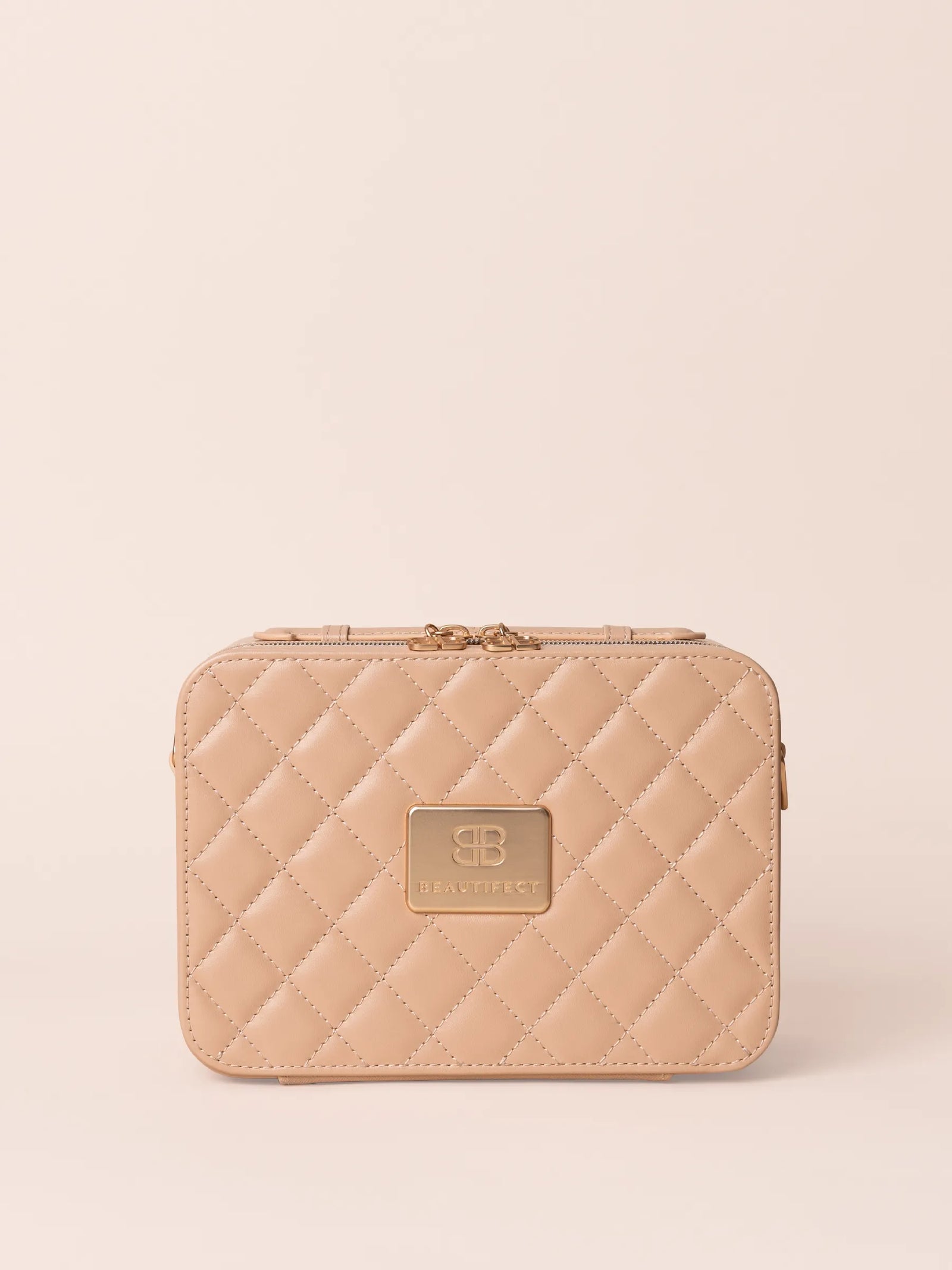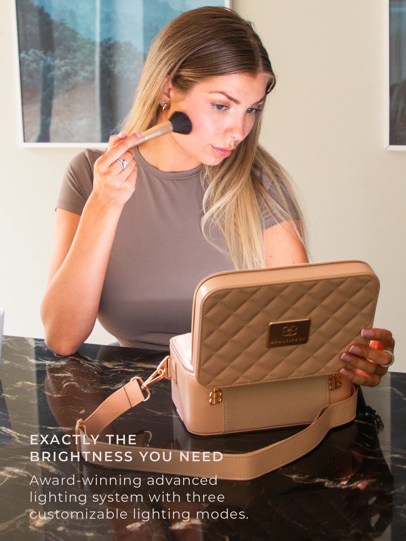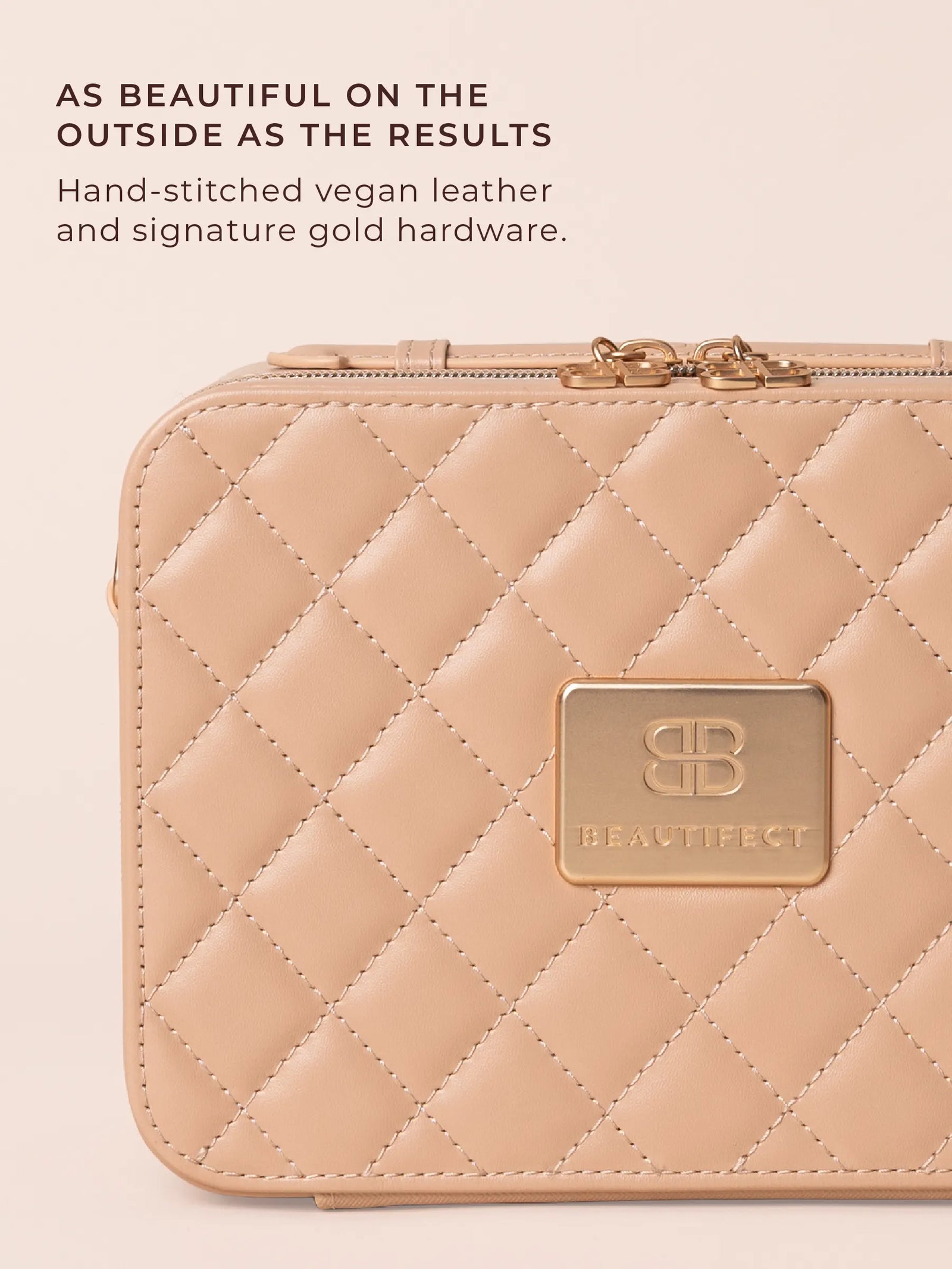 The GO mini, 5x Magnification Mirror and its protective vegan leather sleeve, bundled together in a coordinated Nude finish. The complete portable beauty studio, ready to go straight out of the box.