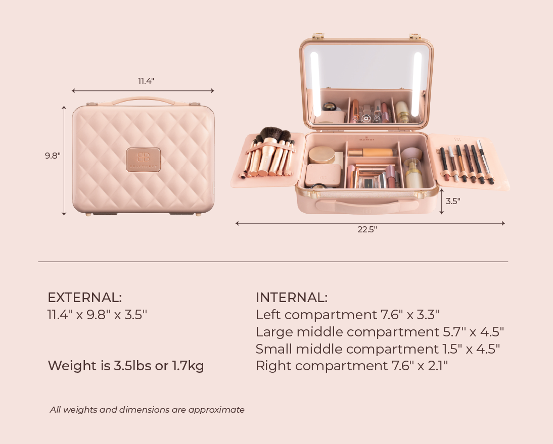 • Rechargeable and cordless luxury vanity case. A single charge via USB-C lasts up to 1 month.