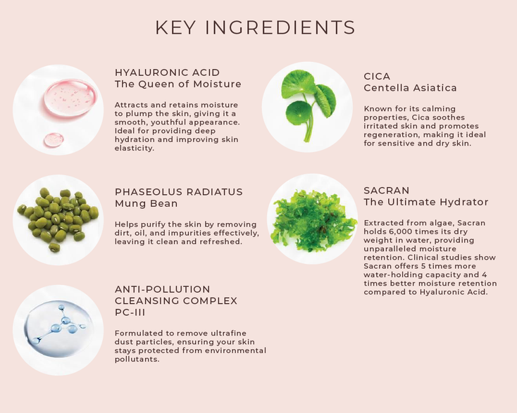 • Cica (Centella Asiatica) – Soothes, calms, and restores skin’s natural barrier, making it perfect for sensitive skin.