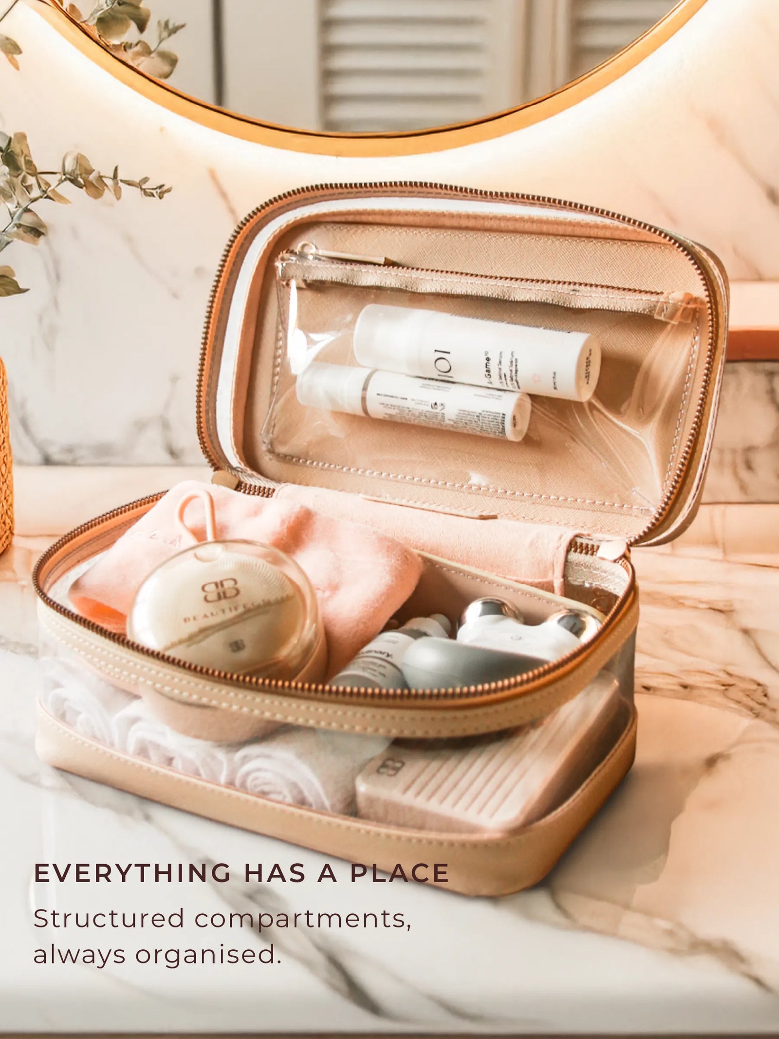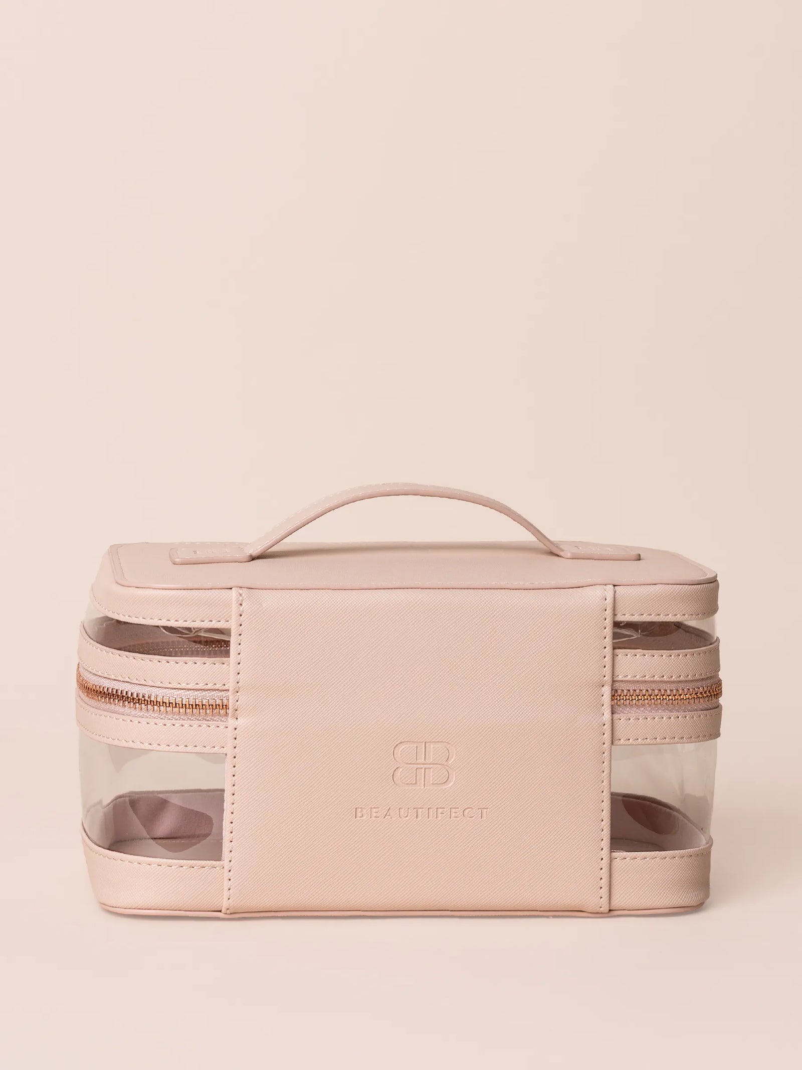 A beautifully structured premium vegan leather vanity bag with large compartments for a full makeup and beauty collection. Spacious, organised, and crafted to the Beautifect luxury standard.