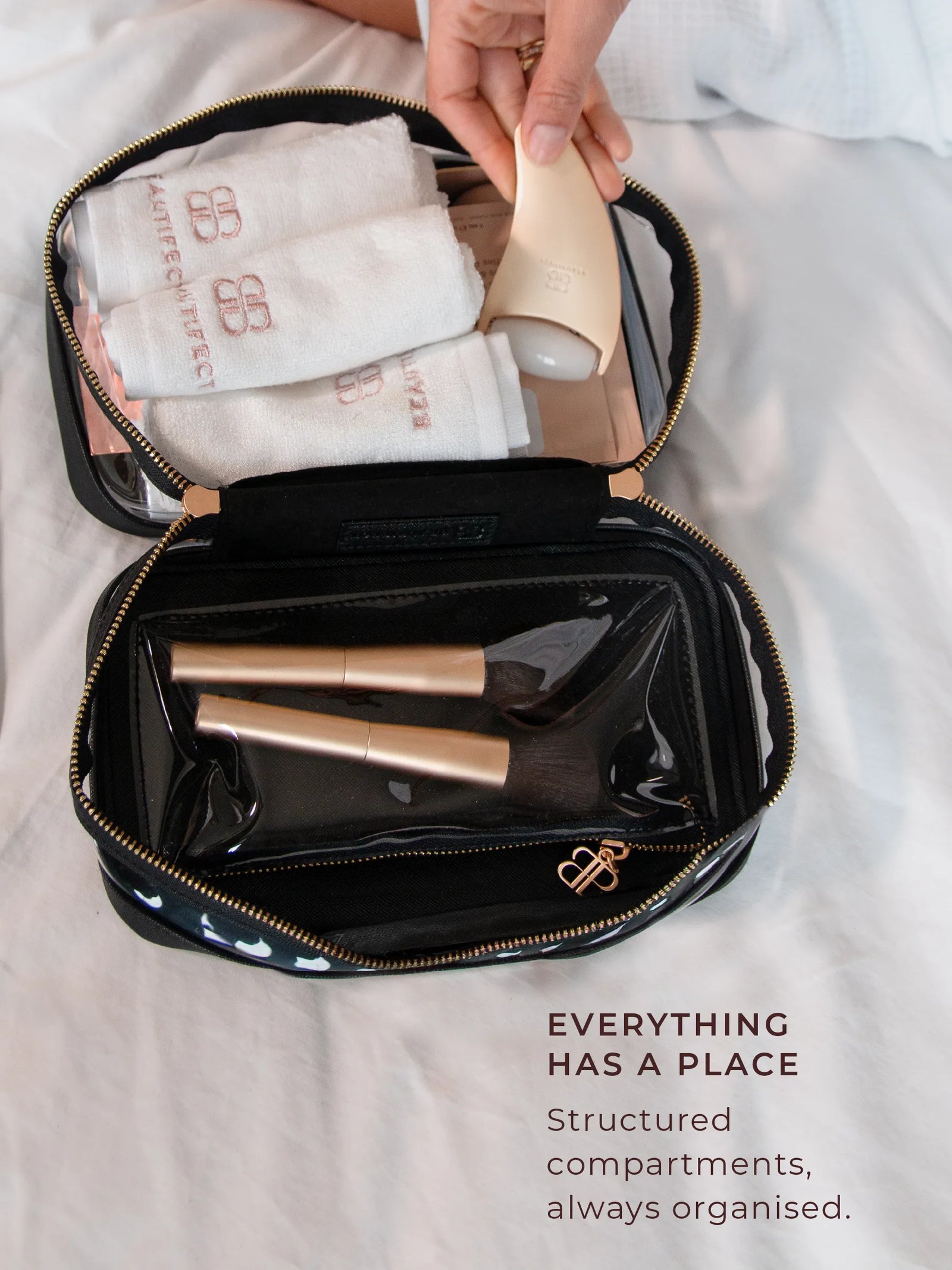 A beautifully structured premium vegan leather vanity bag with large compartments for a full makeup and beauty collection. Spacious, organised, and crafted to the Beautifect luxury standard.