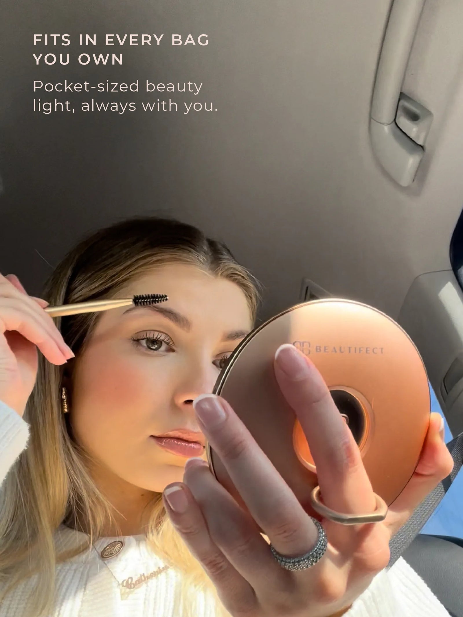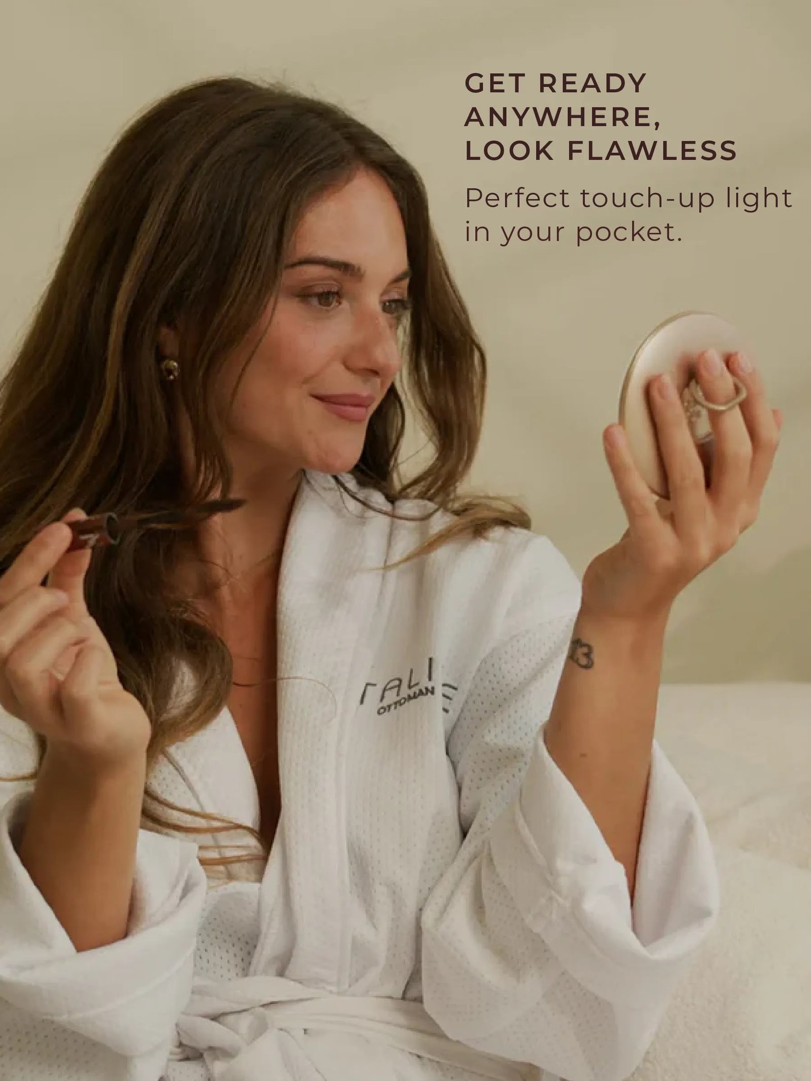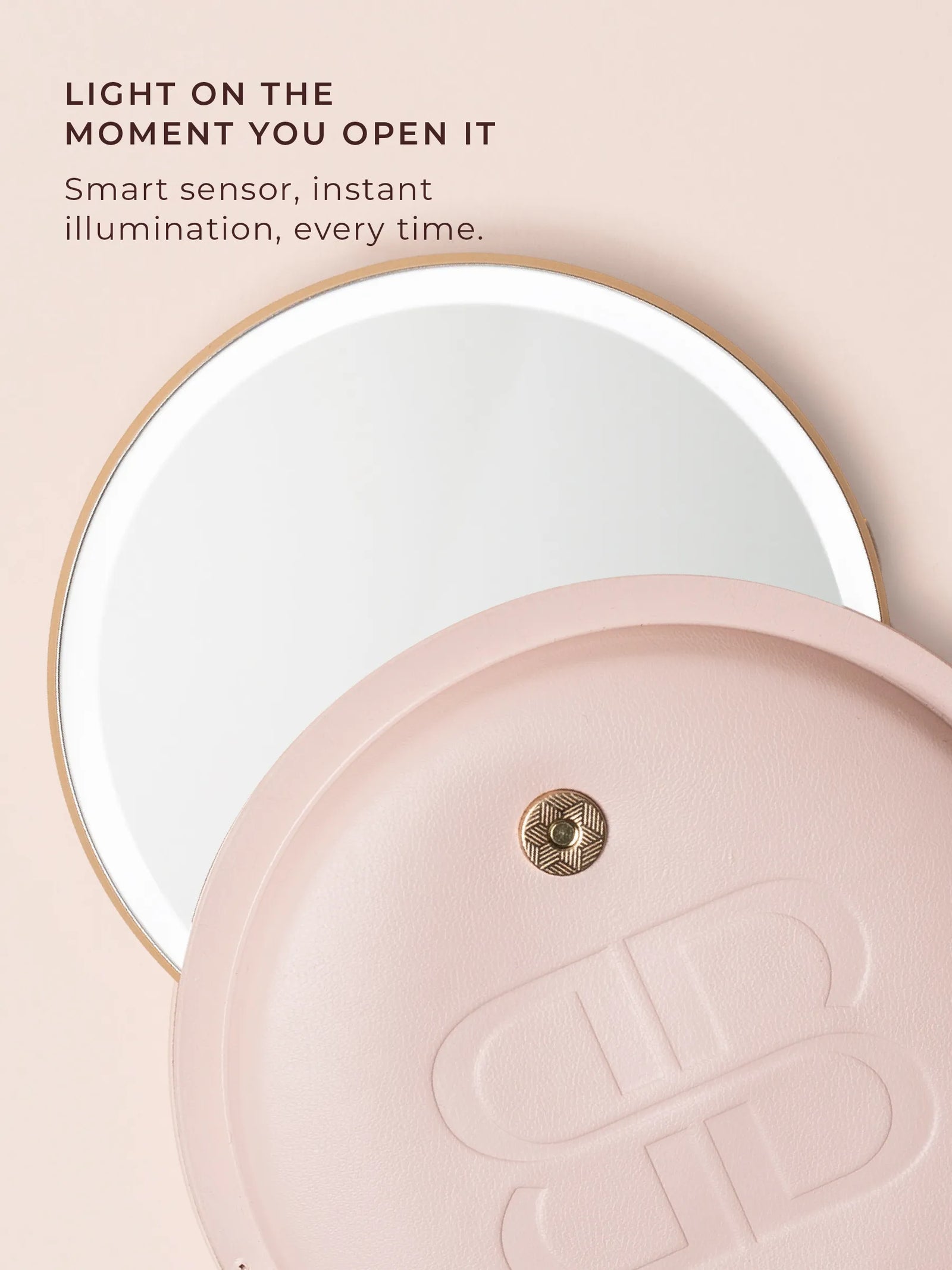A pocket-sized illuminated sensor mirror with true-to-life lighting and vegan leather case. Designed to slip into any bag for professional touch-ups anywhere.