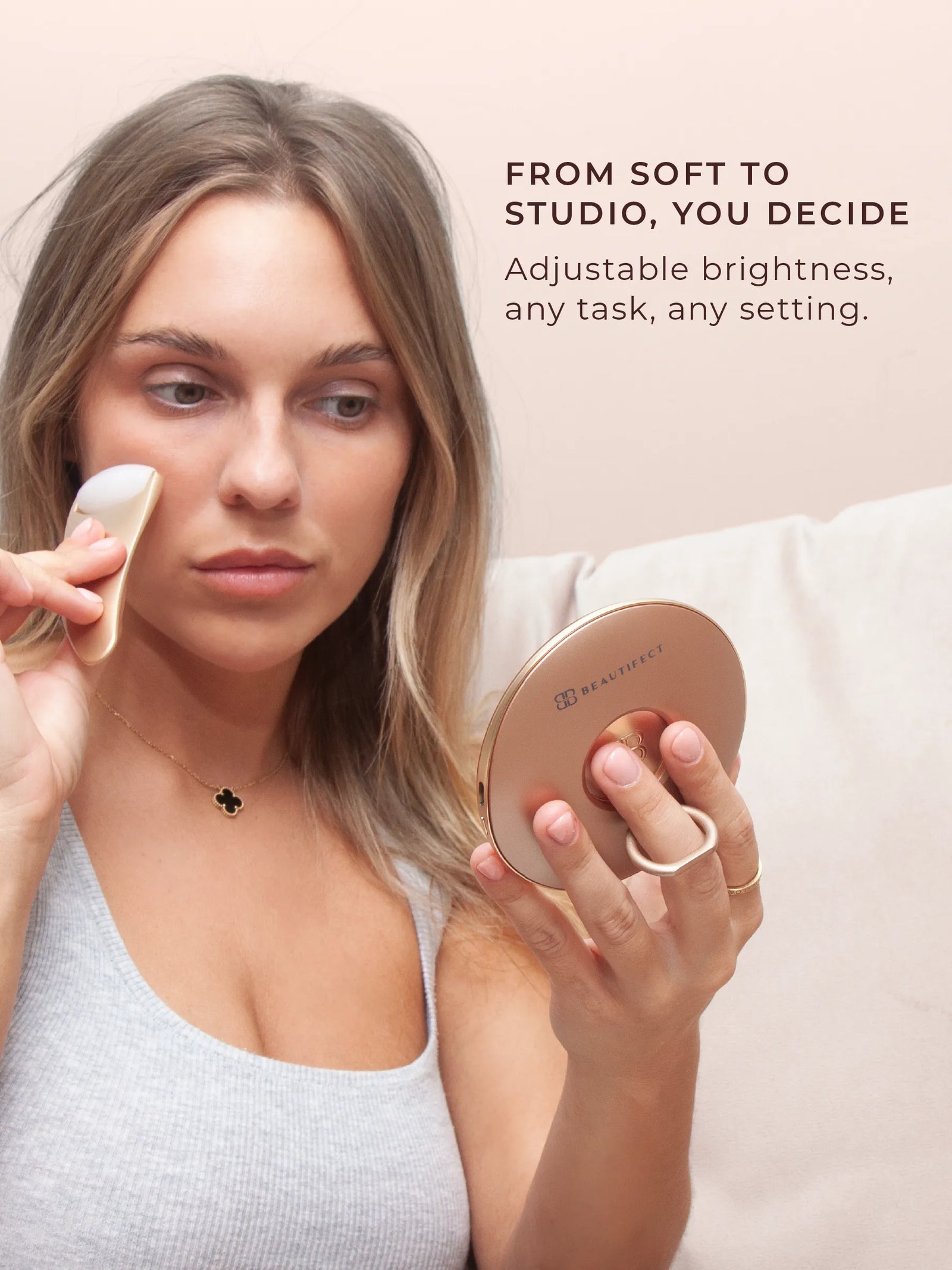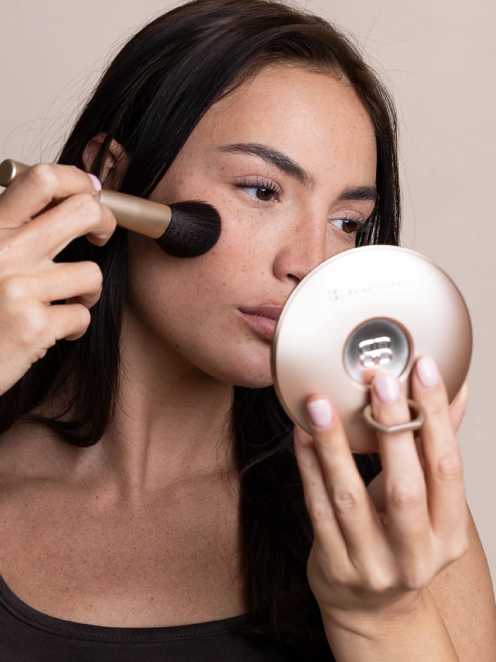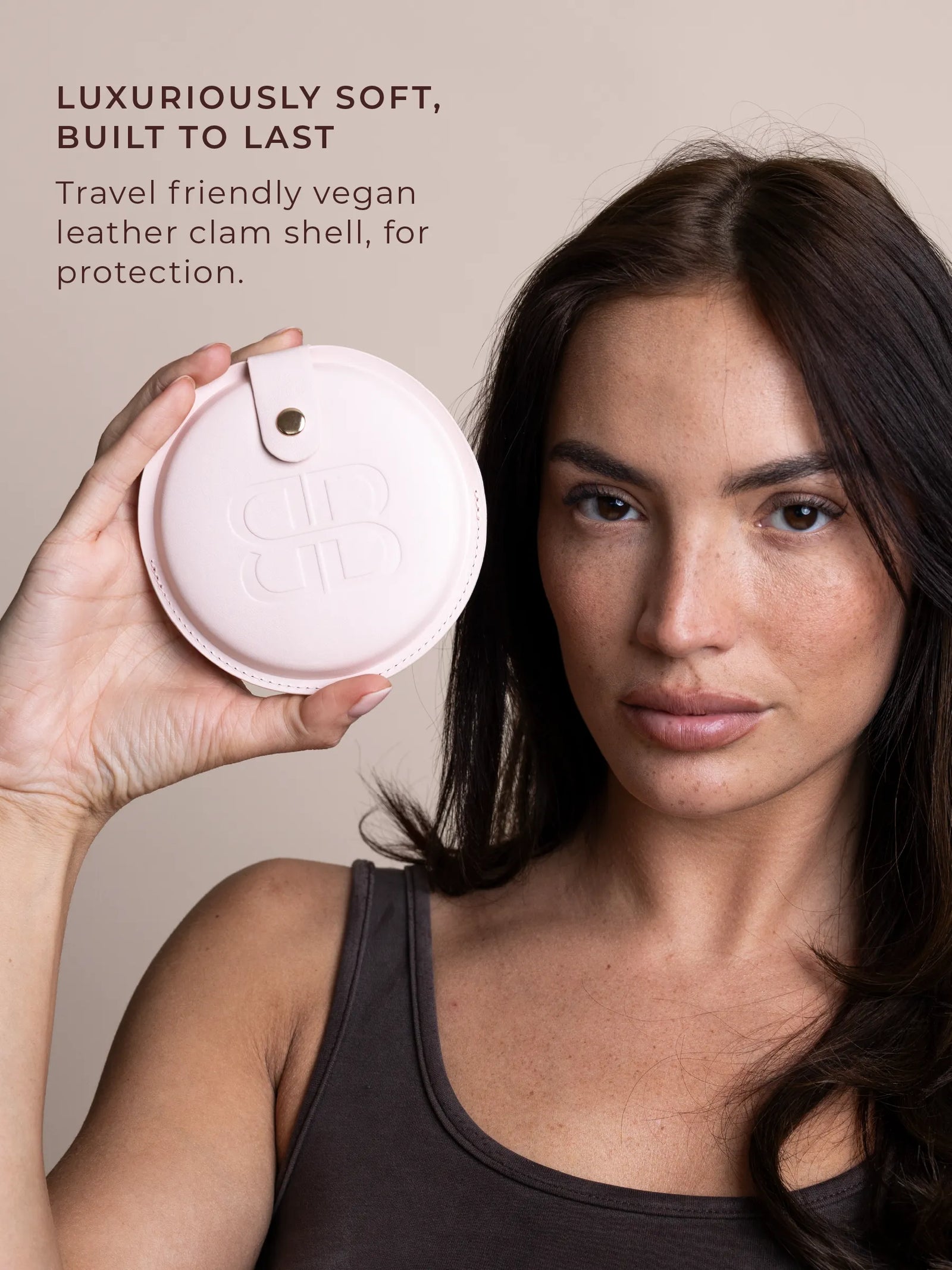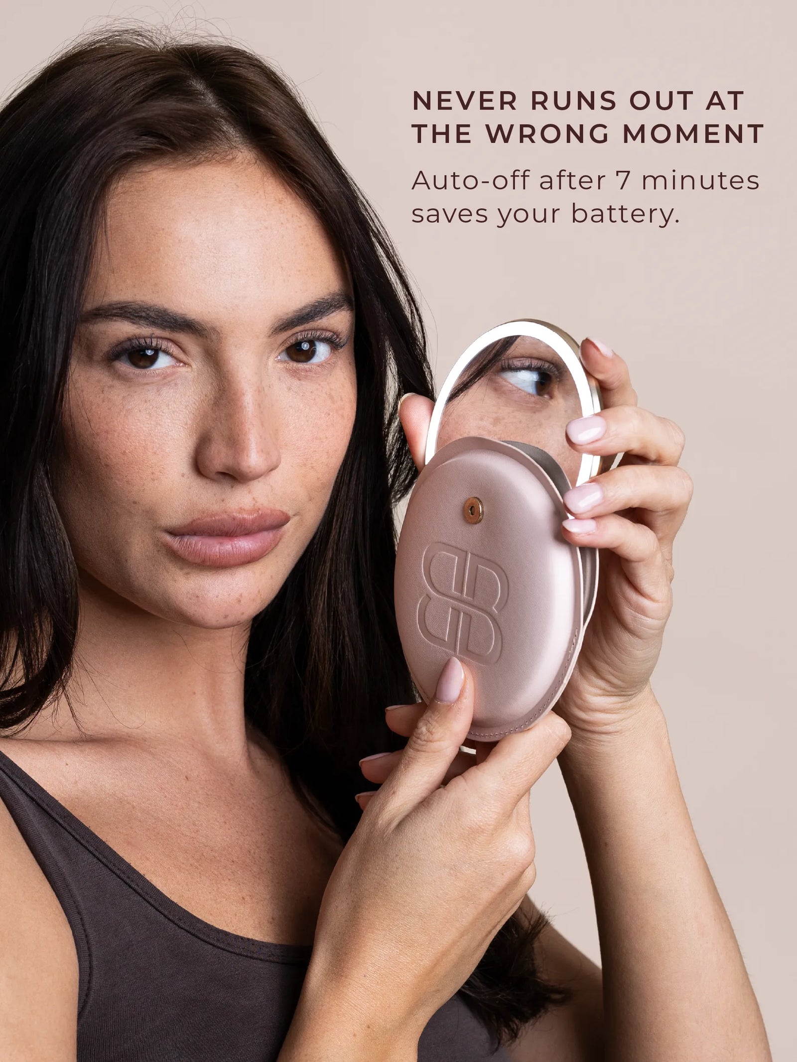 A pocket-sized illuminated sensor mirror with true-to-life lighting and vegan leather case. Designed to slip into any bag for professional touch-ups anywhere.